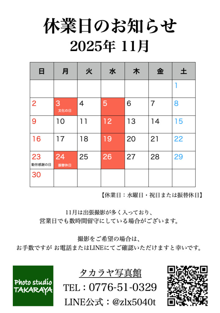 Blog 今月の休業日 2025.10.31 11月の休業日について INDEX 営業日でも数時間留守にする場合がございます。撮影をご希望の際には、予めご予約の上 ご来店いただけますと幸いです。 ブログ一覧