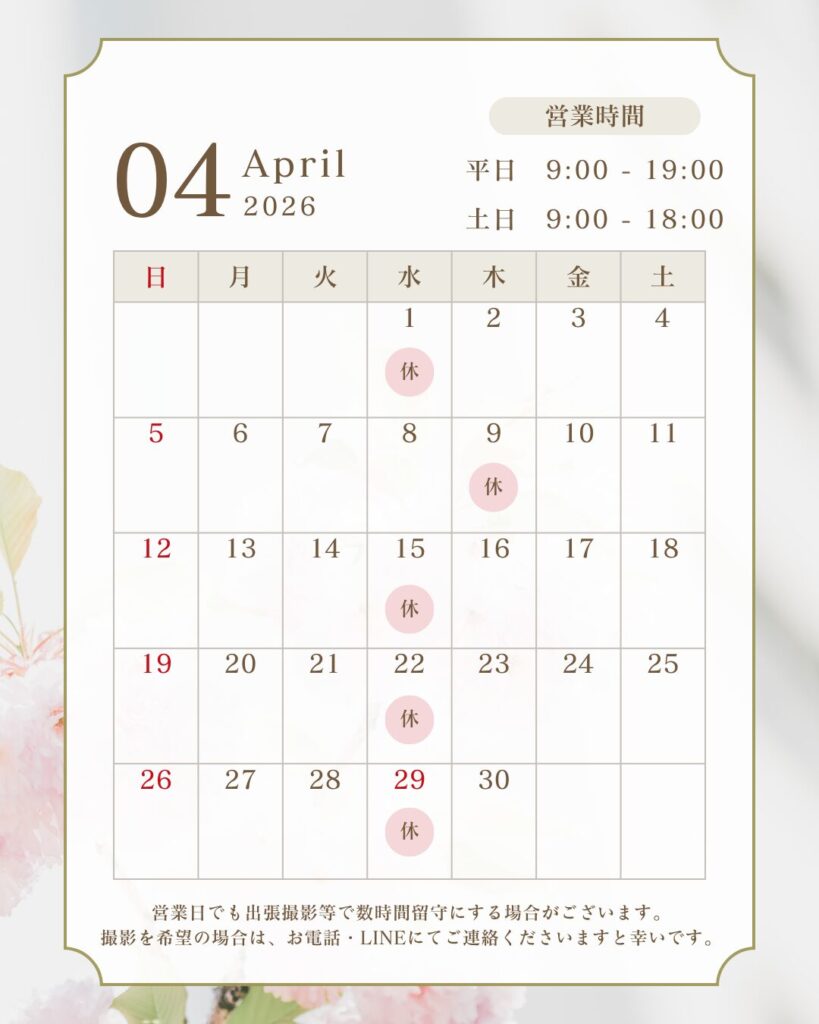 Blog 今月の休業日 2026.04.03 4月の休業日について INDEX 坂井市内の小中学校 入学式のため、8日(水)は営業・9日(木)は振替休業となります 坂井市内の小中学校 入学式のため、8日(水)は営業・9日(木)は振替休業となります 営業日でも数時間留守にする場合がございます。撮影をご希望の際には、予めご予約の上 ご来店いただけますと幸いです。 ブログ一覧